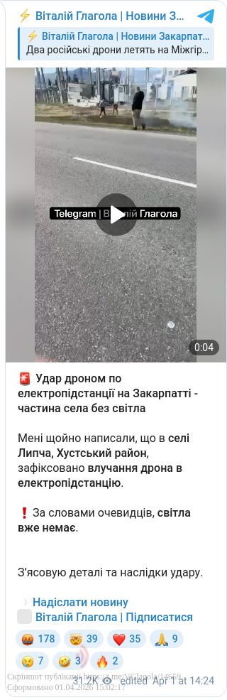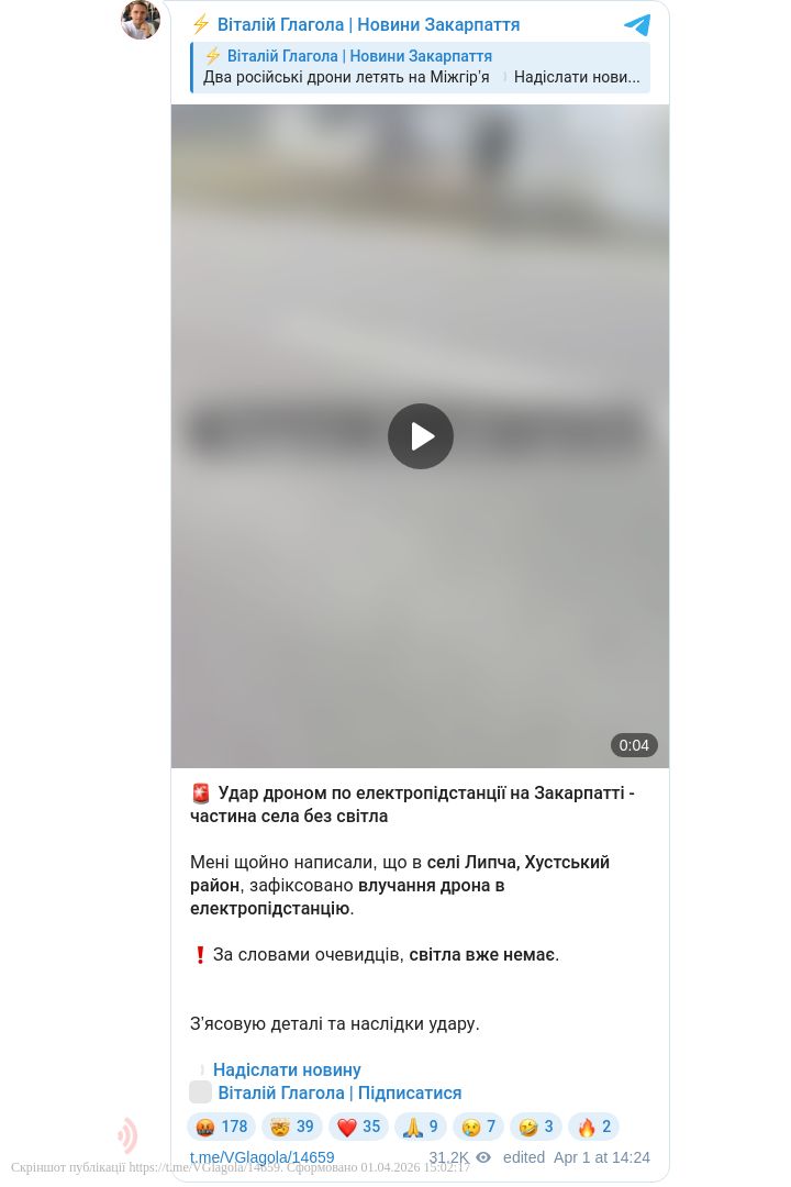 За його словами, інцидент стався у селі Липча Хустського району. Очевидці повідомляють, що після удару зникло світло. Попередньо, безпілотник влучив поруч із підстанцією, однак об’єкт зазнав пошкоджень.