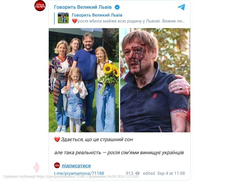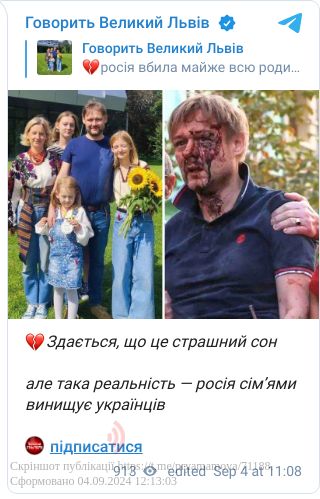 «Після сьогоднішньої атаки живим на цьому фото залишився лише чоловік. Дружина Євгенія та троє їхніх доньок — Ярина, Дарина та Емілія — загинули у власному будинку».
