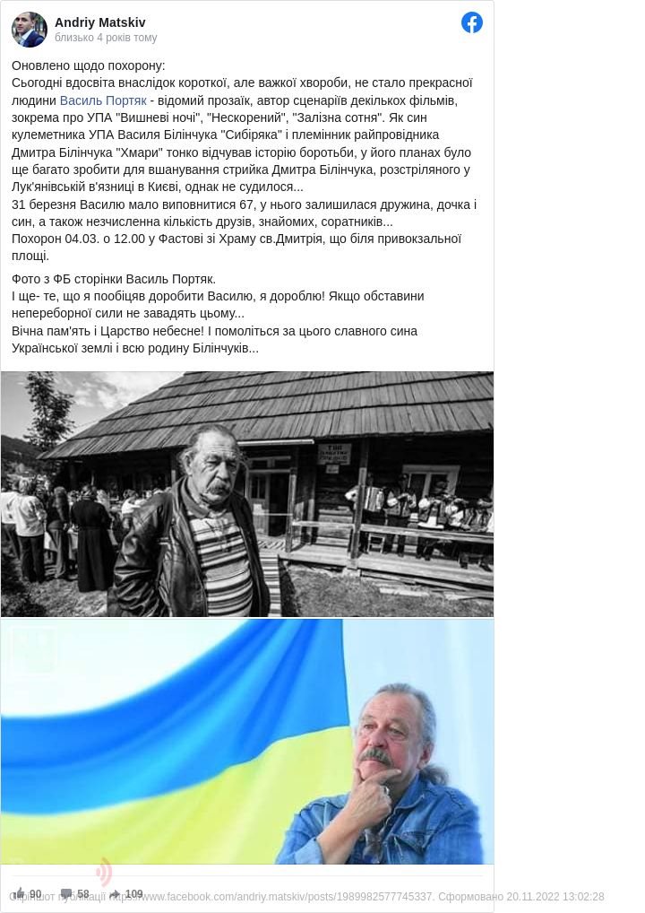 «Сьогодні вночі внаслідок короткої, але важкої хвороби, не стало прекрасної людини Василя Портяка - відомого прозаїка, автора сценаріїв декількох фільмів, зокрема про УПА «Вишневі ночі», «Нескорений», «Залізна сотня». Як син кулеметника УПА Василя Білінчука «Сибіряка» і племінник райпровідника Дмитра Білінчука «Хмари» він тонко відчував історію боротьби. У його планах було ще багато зробити для вшанування стрийка Дмитра Білінчука, розстріляного у Лук'янівській в'язниці в Києві, однак не судилося...», - написав Андрій Мацьків.