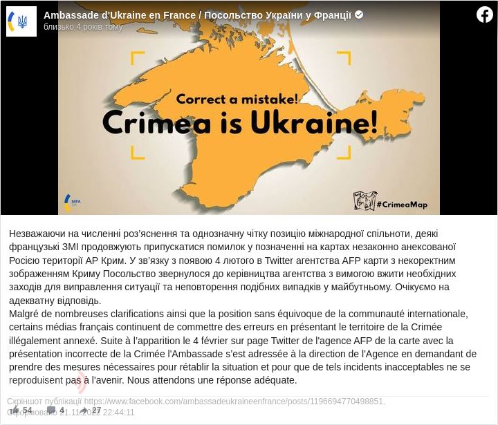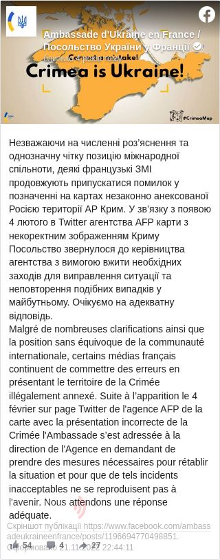 «Деякі французькі ЗМІ продовжують припускатися помилок у позначенні на картах незаконно анексованої Росією території АР Крим. У зв’язку з появою 4 лютого в Twitter агентства AFP карти з некоректним зображенням Криму Посольство звернулося до керівництва агентства з вимогою вжити необхідних заходів для виправлення ситуації та неповторення подібних випадків у майбутньому», - йдеться у повідомленні посольства.