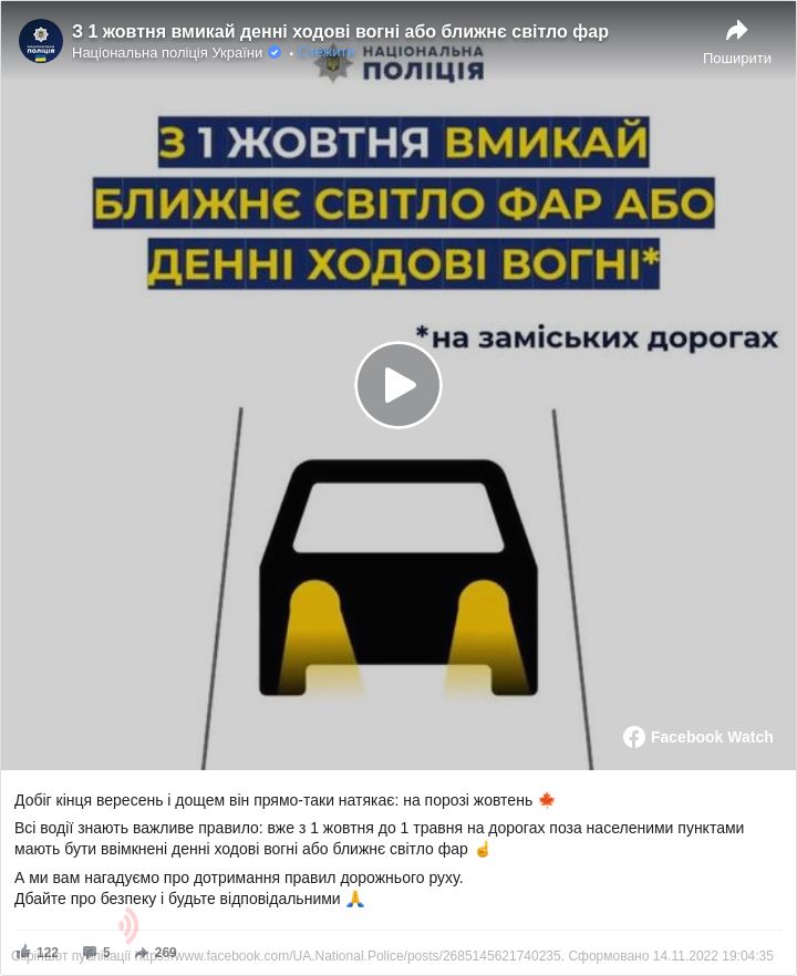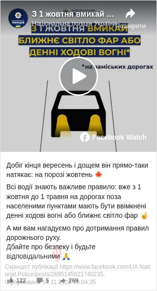 "Добіг кінця вересень і дощем він прямо-таки натякає: на порозі жовтень. Всі водії знають важливе правило: вже з 1 жовтня до 1 травня на дорогах поза населеними пунктами мають бути ввімкнені денні ходові вогні або ближнє світло фар", – йдеться у повідомленні.