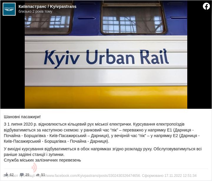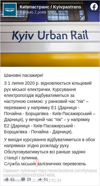 Як відомо, в столиці з 8 червня запрацювали міські електрички, які перевозили пасажирів із житлового масиву Троєщина до станції метро Почайна.