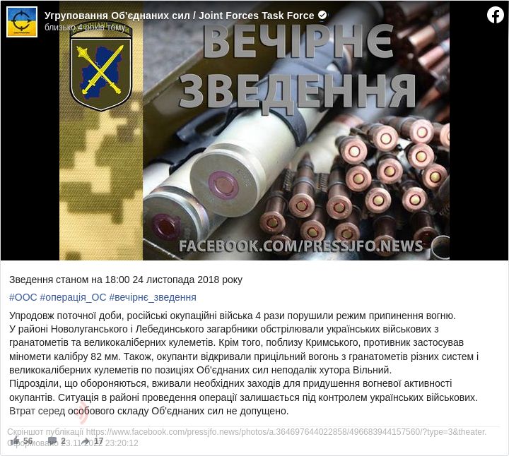 Також, окупанти відкривали прицільний вогонь з гранатометів різних систем і великокаліберних кулеметів по позиціях Об'єднаних сил неподалік хутора Вільний. Як зазначається у повідомленні, підрозділи, що обороняються, вживали необхідних заходів для придушення вогневої активності окупантів.