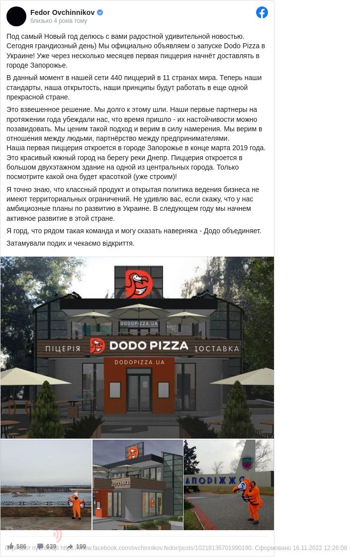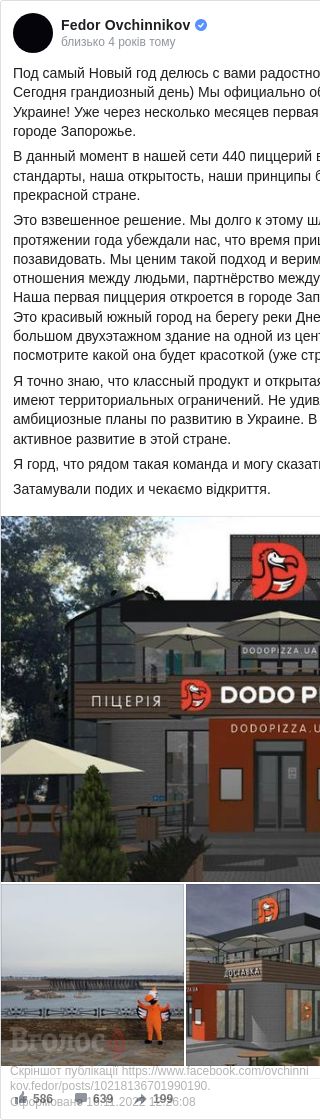 «Ми офіційно оголошуємо про запуск Dodo Pizza в Україні... Наша перша піцерія відкриється в місті Запоріжжі наприкінці березня 2019 року», — повідомив він.