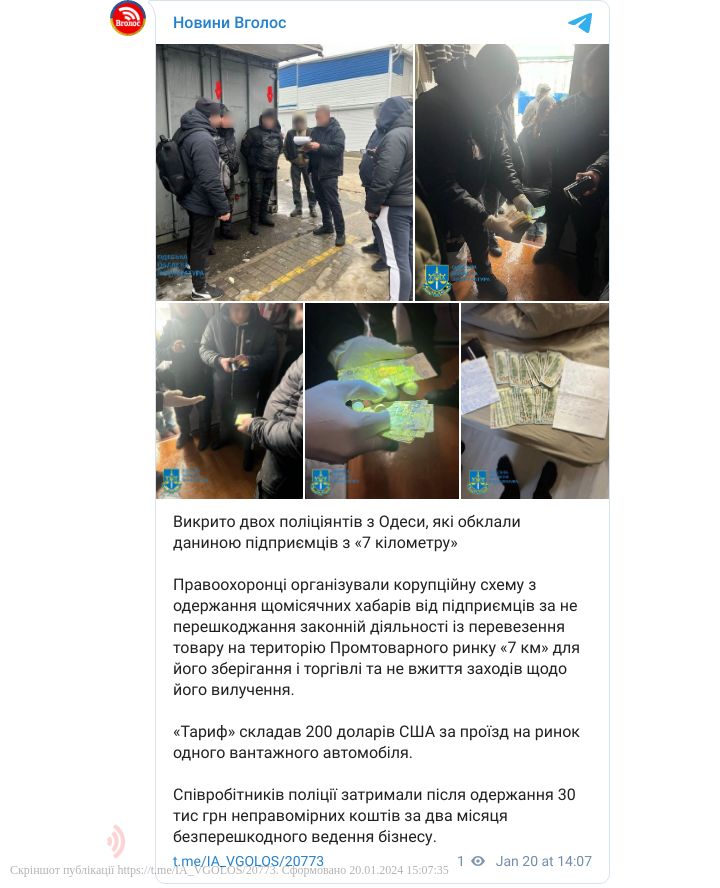За даними слідства, правоохоронці організували корупційну схему з одержання щомісячних хабарів від підприємців за не перешкоджання законній діяльності із перевезення товару на територію Промтоварного ринку «7 км» для його зберігання і торгівлі та не вжиття заходів щодо його вилучення.