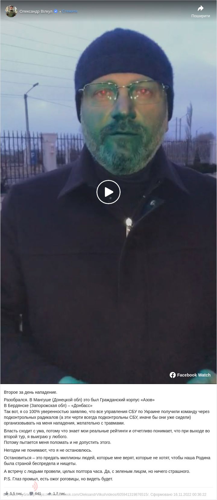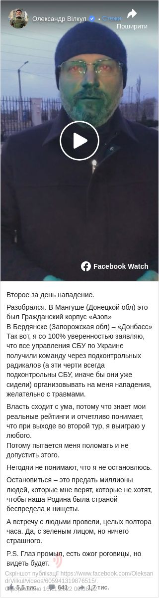 «Другий за день напад ... У Мангуші (Донецька обл.) був »Громадянський корпус «Азов», у Бердянську (Запорізька обл.) - «Донбас». Зі 100% упевненістю заявляю, що усі управління СБУ по Україні отримали команду через підконтрольних радикалів (а вони завжди підконтрольні СБУ, інакше б уже сиділи) організовувати на мене напади, бажано з травмами«, - заявив народний депутат.