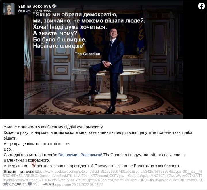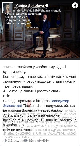 Всіх. Сьогодні прочитала інтерв’ю Володимир Зеленський TheGuardian і подумала, ой, так це ж слова Валентини з ковбасного. Але ж дивно... Валентина - явно не президент. А Президент - явно не Валентина з ковбасного. Втім це не точно...", - написала Соколова.