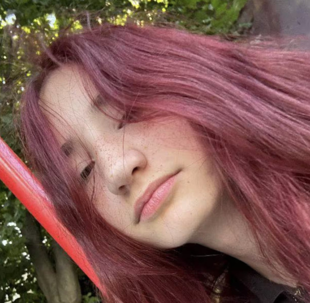 Опис: ріст 160 см, волосся червоного кольору, одягнена у чорну куртку з білим надписом, чорні штани та чорні з білим кросівки.