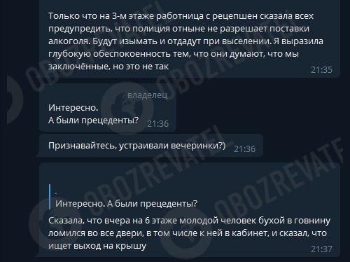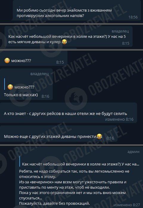 «Спливло» листування про те, як мешканці готелю спілкуються наживо, порушують умови ізоляції, обмінюються їжею та ковдрами, замовляють разом алкоголь, сигарети та каву.