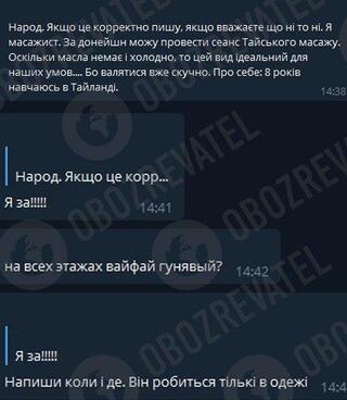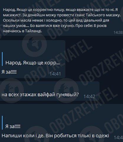 «Потрібно говорити та писати, які ми тут розумники (що правда)! Дуже акуратно говорити про все (про ходіння по поверхах, природно, не говоримо). Але не потрібно говорити, як нам тут круто, бо будемо виглядати охр**ілими мажорами, яким ще й лакшері-умови влаштували. Доносити потрібну нам інформацію. З їх питань можна з'їжджати, йти від відповідей та інше». Пізніше було вирішено приховувати взагалі всю інформацію, в тому числі й те, що людей погодилися відпустити по домівках на самоізоляцію, якщо ПЦР-тести на коронавірус у них негативні.