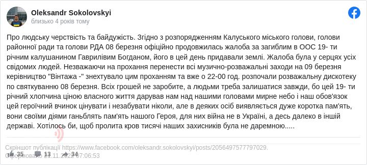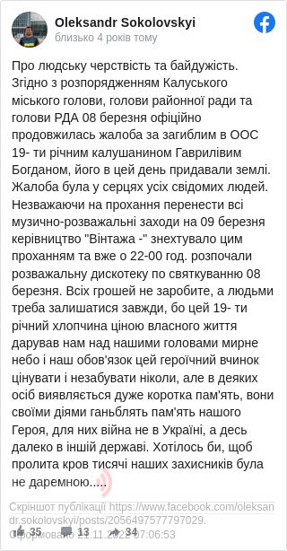 «Про людську черствість і байдужість. Жалоба була у серцях усіх свідомих людей. Незважаючи на прохання перенести всі музично-розважальні заходи на 9 березня, керівництво «Вінтажа», знехтувало цим проханням та вже о 22.00 год. розпочали розважальну дискотеку щодо святкування 8 березня. Всіх грошей не заробите, а людьми треба залишатися завжди, бо цей 19-річний хлопчина ціною власного життя дарував нам над нашими головами мирне небо і наш обов'язок цей героїчний вчинок цінувати і не забувати ніколи», - написав Олександр Соколовський.