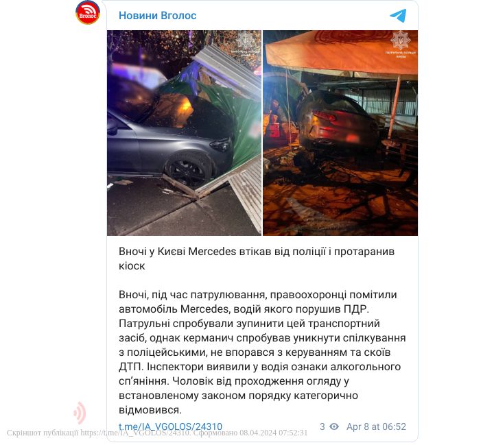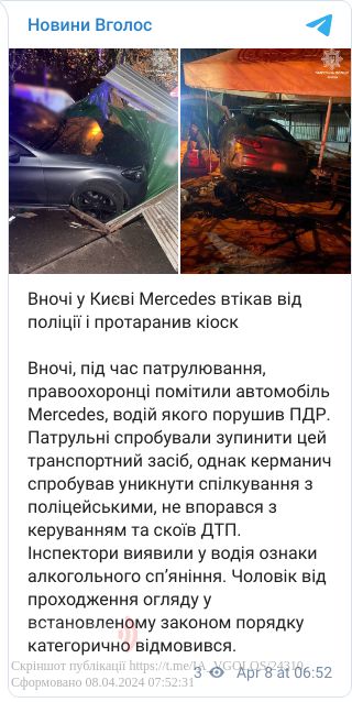 Патрульні спробували зупинити цей транспортний засіб, однак керманич спробував уникнути спілкування з поліцейськими, не впорався з керуванням та скоїв ДТП. На щастя ніхто не постраждав.