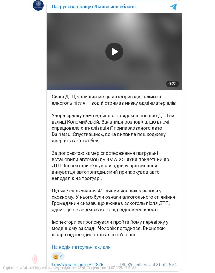 «Інспектори з’ясували адресу проживання винуватця автопригоди, який припаркував авто неподалік на тротуарі. Під час спілкування 41-річний чоловік зізнався у скоєному. У нього були ознаки алкогольного сп’яніння», — йдеться в повідомленні патрульних.