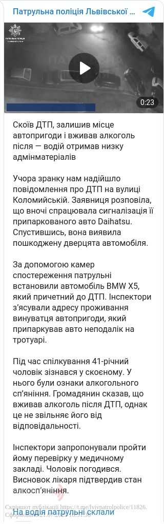 В неділю, 20 липня, патрульні отримали повідомлення про ДТП на вулиці Коломийській. Потерпіла розповіла, що вночі спрацювала сигналізація її припаркованого Daihatsu. За допомогою камер спостереження патрульні встановили, що водій BMW X5 врізався у бічні двері автомобіля.