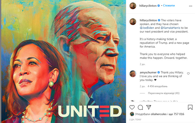 Американська політична і державна діячка, державна секретарка США Гіларі Клінтон відреагувала на перемогу демократа Джо Байдена на виборах в США.