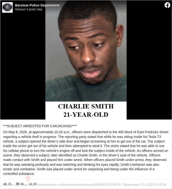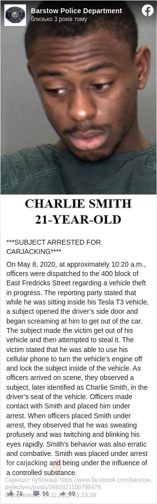 Тоді власник скористався спеціальним додатком на своєму смартфоні і заблокував рух Tesla, а заодно закрив автокрадія у салоні. Поліцейські, які прибули на місце події, побачили злочинця, який поводився абсолютно неадекватно. Пізніше виявилося, що викрадач, 21-річний Чарлі Сміт, був в стані алкогольного сп'яніння. Йому пред'явили звинувачення в угоні і заарештували.