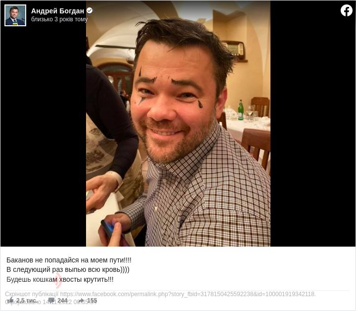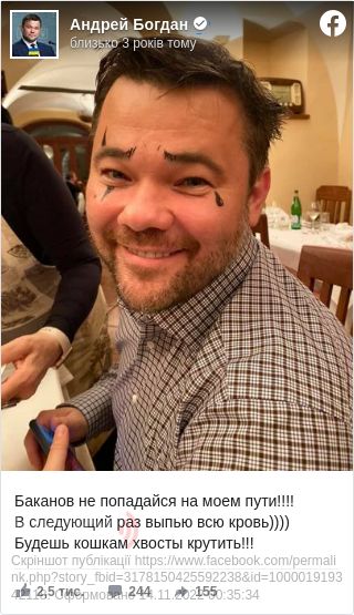 «Баканов, не попадайся на моєму шляху. Наступного разу вип'ю всію кров. Будеш кішкам хвости крутити».