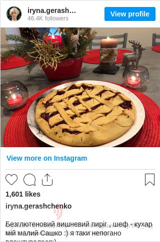 «Безглютеновий вишневий пиріг, шеф-кухар - мій малий Сашко :) я таки непогано влаштувалася:)», - написала Геращенко.