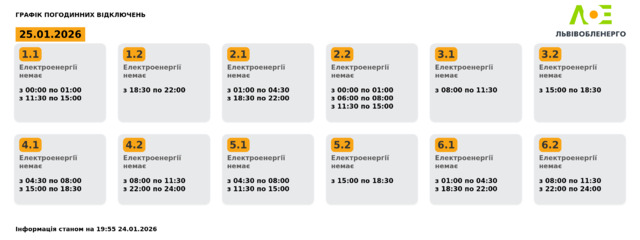 У неділю, 25 січня, на Львівщині діятимуть графіки відключення світла. Протягом дня графіки можуть змінитися.
