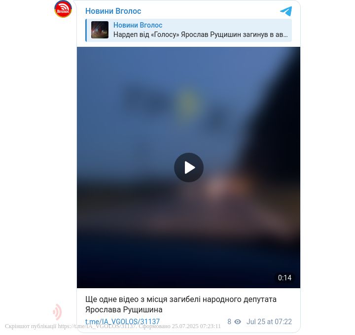 Народний депутат від партії «Голос» зі Львова Ярослав Рущишин загинув у дорожньо-транспортній пригоді в селі Бабухів Рогатинської громади, що на Івано-Франківщині. Він їхав мотоциклом і, ймовірно, зіткнувся з причепом трактора. Ярослав Рущишин помер від отриманих травм до приїзду «швидкої».