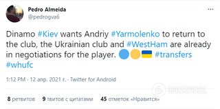 Наразі 31-річний атакувальний півзахисник виступає за англійський «Вест Гем». Згідно з даними Алмейди, кияни вже розпочали перемовини з «молотобійцями».
