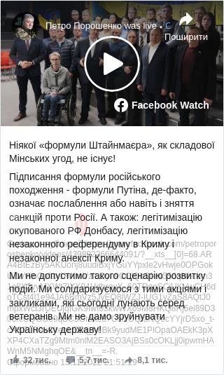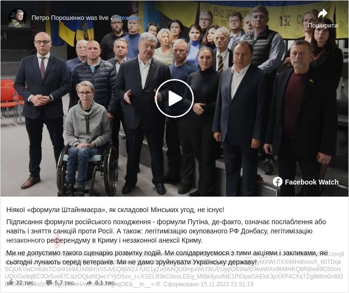 «Підписання зазначеної формули російського походження ... де-факто означає ослаблення або навіть зняття санкцій проти РФ, легітимізацію російської окупації окупованого Донбасу, легітимізацію незаконного референдуму Криму та незаконної анексії Криму. Ми твердо підкреслюємо: ми ніколи не підемо на це, ми солідаризуємось з тими акціями і з закликами, які сьогодні звучать серед ветеранів, і ми не дамо зруйнувати українську державу», - сказав Порошенко в відеозверненні, оприлюдненому у вівторок увечері.