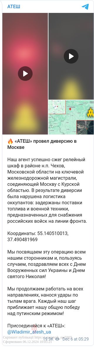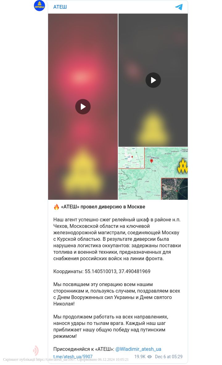 «Агент успішно спалив релейну шафу в районі н.п. Чехов, Московської області на ключовій залізничній магістралі, що з'єднує Москву з Курською областю», - йдеться в повідомленні.