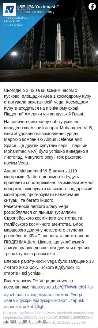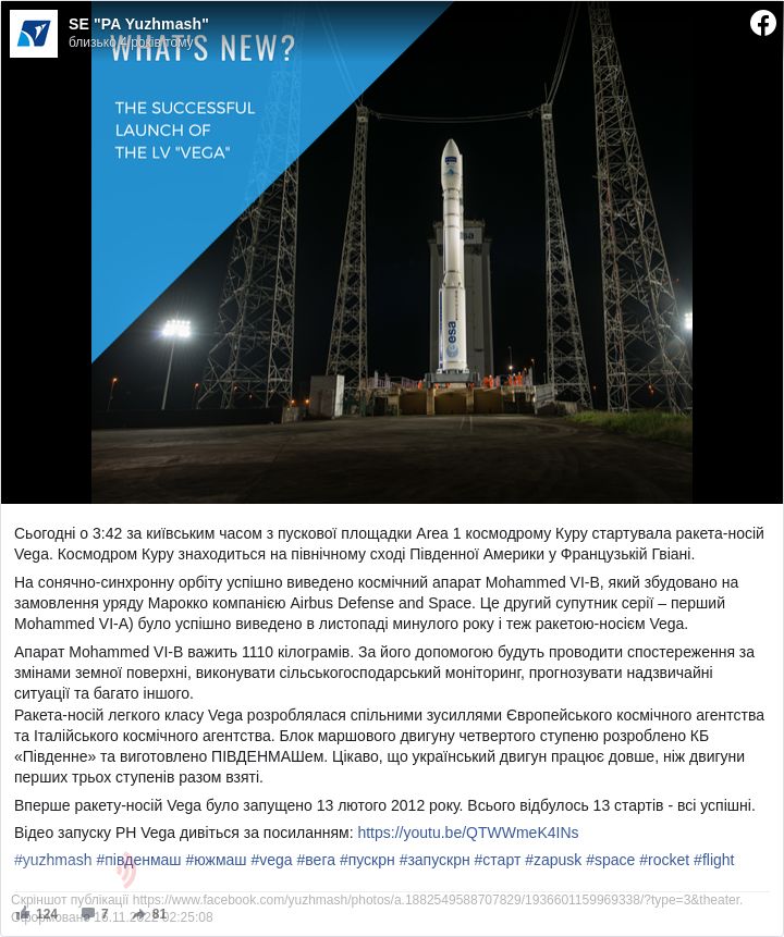 «На сонячно-синхронну орбіту успішно виведено космічний апарат Mohammed VI-B, який збудовано на замовлення уряду Марокко компанією Airbus Defense and Space. Це другий супутник серії — перший Mohammed VI-А було успішно виведено в листопаді минулого року і теж ракетою-носієм Vega», — йдеться у повідомленні Південмашу.