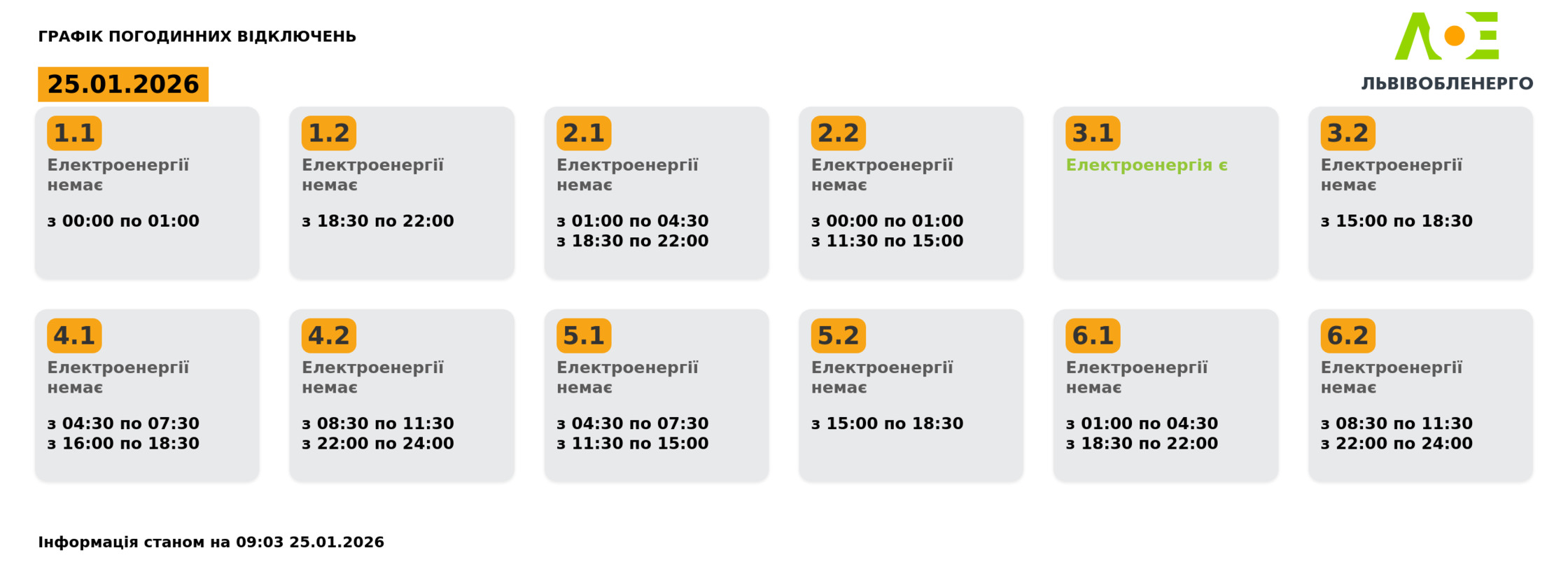 Група 6.2. Електроенергії немає з 08:30 до 11:30, з 22:00 до 24:00.