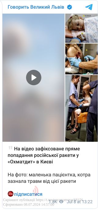Вдень 8 липня Росія масовано вдарила ракетами по Києву. Одна влучила по дитячій лікарні Охматдит.