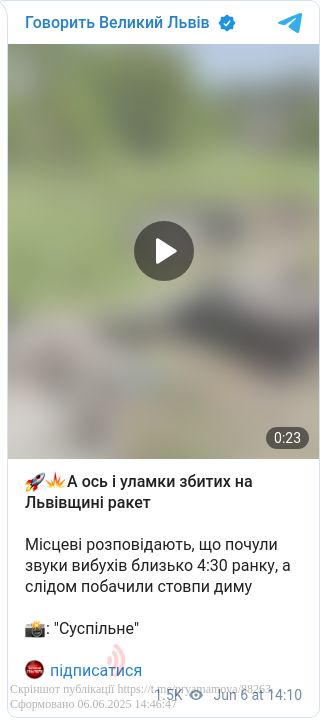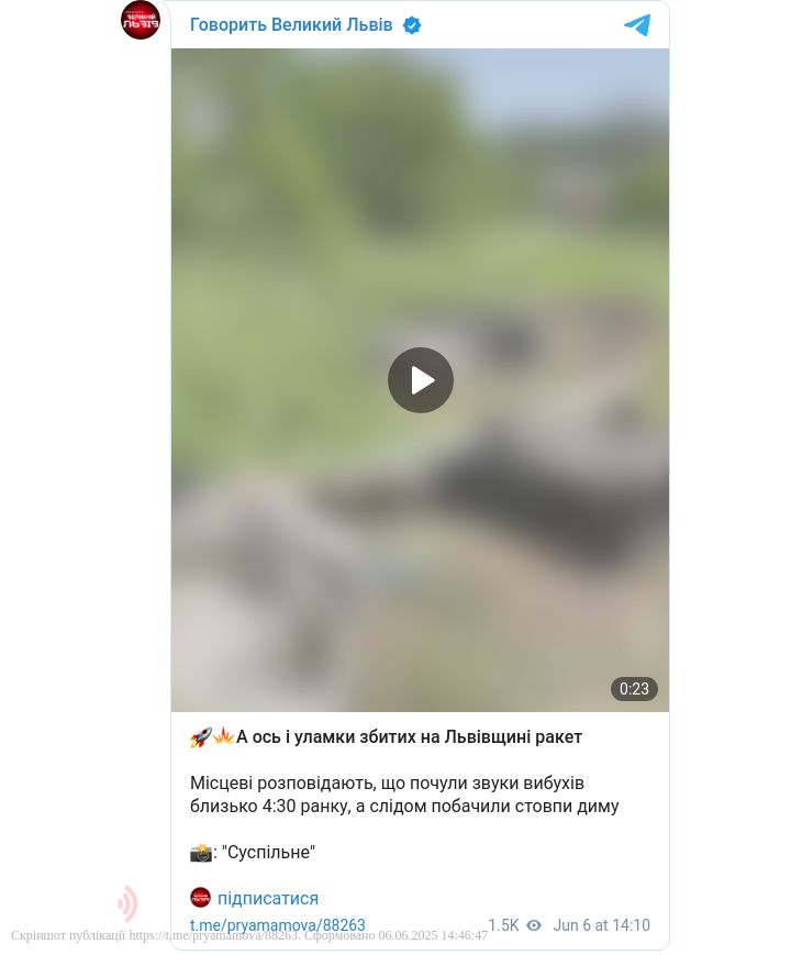 У п'ятницю, 6 червня, армія РФ атакувала Львівщину бойовими безпілотниками та ракетами. Звуки вибухів було чутно й у Львові. Попередньо, жертв та травмованих внаслідок атаки немає.
