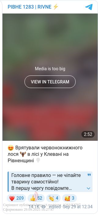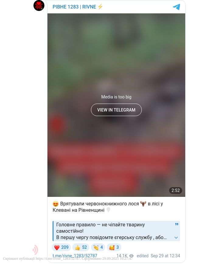 Як повідомили в громадській організації, випадок стався у Клевані. Грибники натрапили на лося, що застряг у трясовині, та відразу підняли тривогу. До порятунку долучилися єгері й лісівники. За допомогою трактора тварину витягнули. На щастя, вона залишилася не ушкодженою.