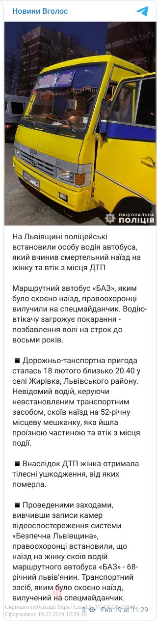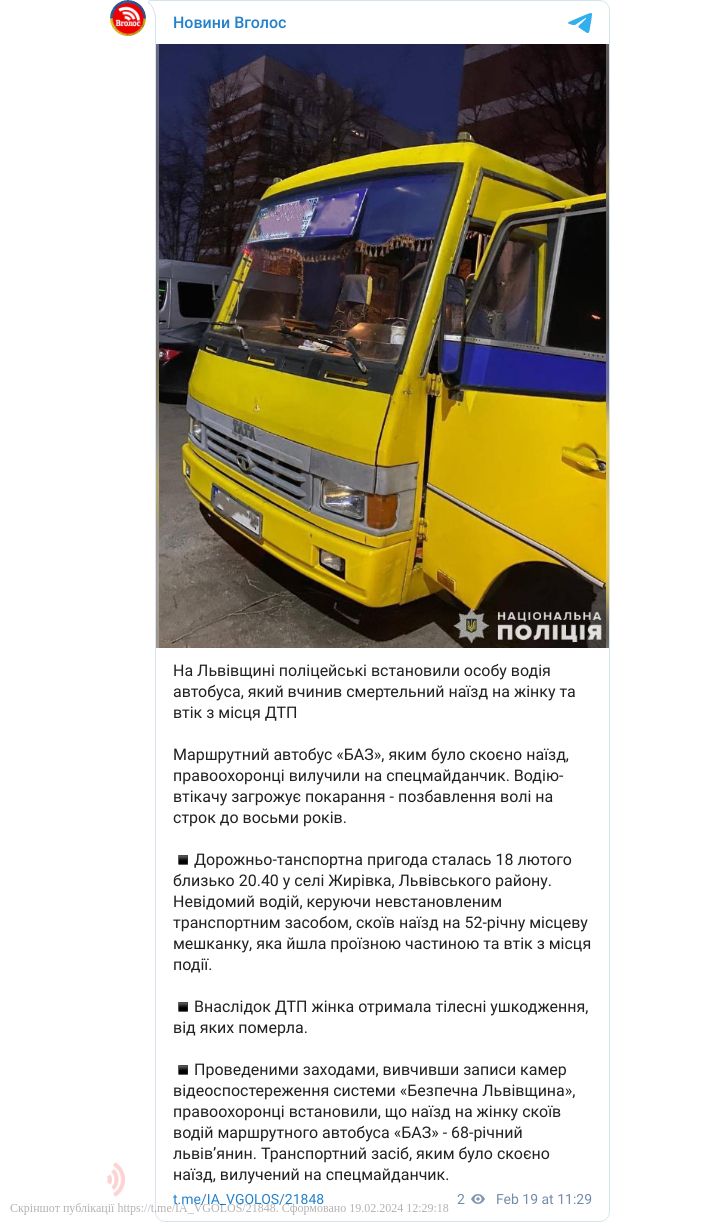 На Львівщині поліцейські встановили особу водія автобуса, який вчинив смертельний наїзд на жінку та втік з місця трагедії.