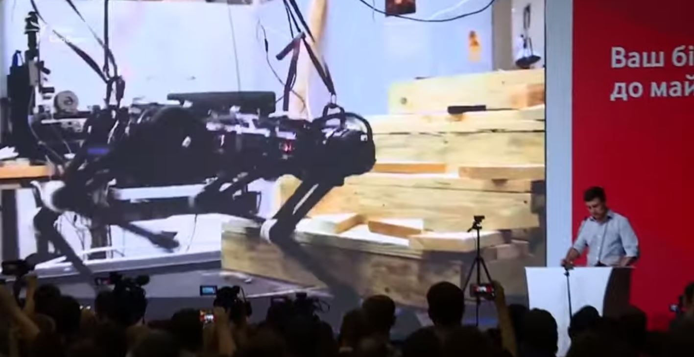 Розповідаючи про інновації на Заході, Зеленський показав відео з роботом у вигляді собаки, який стрибав і пересувався по доріжці. «Ось у цьому світі», – сказав президент на початку цього відео.