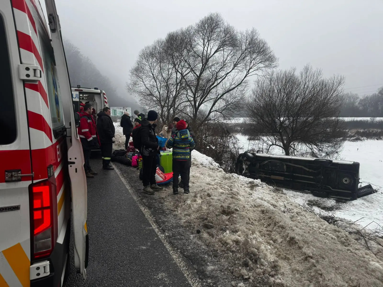«Сьогодні о 08:36 мікроавтобус Mercedes Sprinter через ожеледицю раптово з’їхав з траси та перекинувся на бік», — розповів медійник.