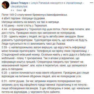 Також вона повідомила, що потяг значно затримався на станції у місті Тернопіль, але пасажирів про це не повідомили.