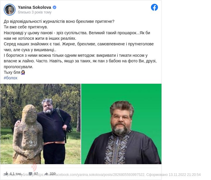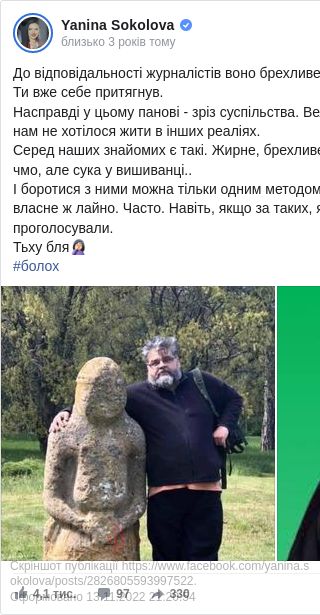 «Жирне, брехливе, самовпевнене і прутнеголове чмо, але, с*ка, в вишиванці», – зазначила телеведуча.
