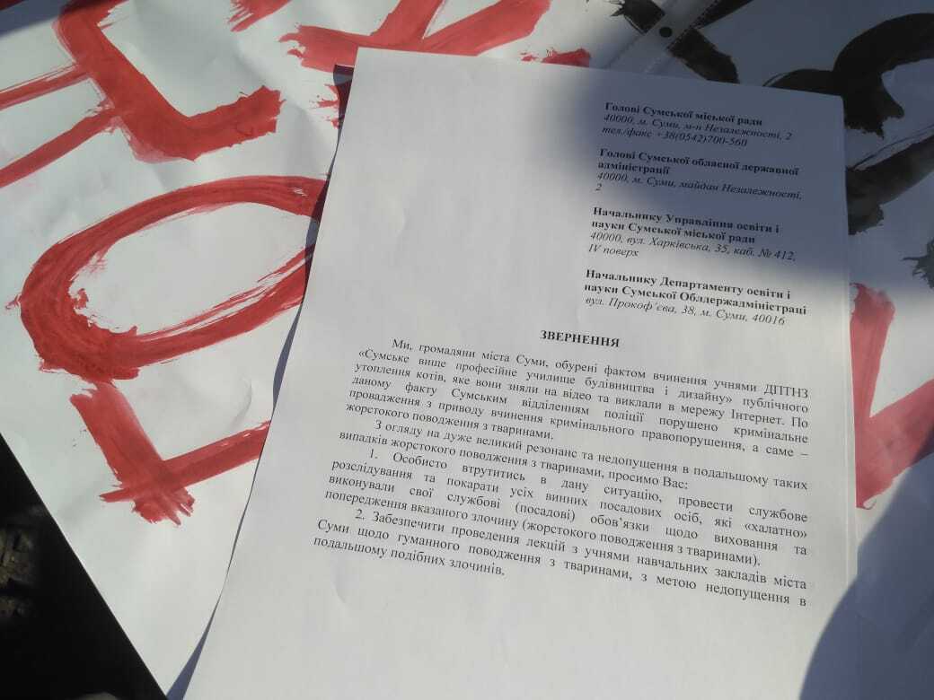 Активісти вийшли з плакатами під училище, а також написали звернення до керівництва міста з проханням втрутитися в ситуацію, забезпечити проведення лекцій в Сумах для учнів, та покарати службових осіб, «які халатно виконували свої обов'язки щодо виховання і попередження злочину».
