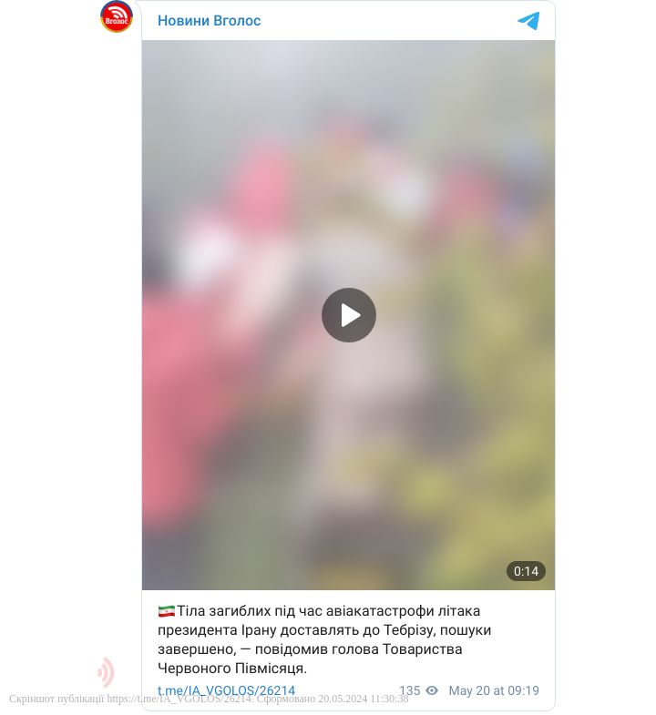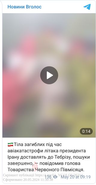 Нагадаємо, 19 травня стало відомо, що гелікоптер з президентом Ірану Раїсі та іншими чиновниками на борту здійснив жорстку посадку в провінції Східний Азербайджан на північному заході країни. З того часу інформації про стан глави держави не було.