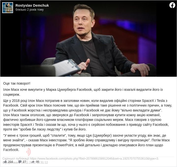 "У мене є трохи грошей, щоб "спалити", тому, якщо Цук (Цукерберг) захоче укласти угоду, він знає, де мене знайти", - сказав Маск інвесторам. "Я зроблю йому справедливу і вигідну пропозицію". Потім Маск продемонстрував презентацію в PowerPoint, в якій детально і докладно описувався його план щодо Facebook", - резюмував Демчук.