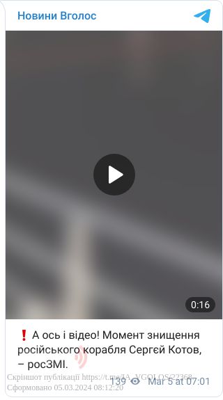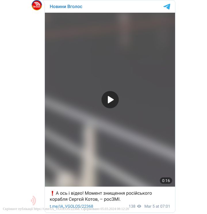 «Як повідомляє наше джерело, в морі потоплено патрульний корабель «Сергій Котов«». Інформація потребує підтвердження», - йдеться у повідомленні.