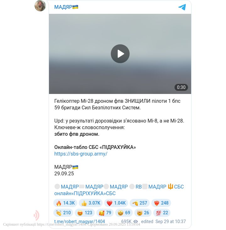 Українські захисники за допомогою FPV-дрона збили ворожий гелікоптер Мі-28. Орієнтовна вартість повітряного судна становить 15–18 мільйонів доларів США.