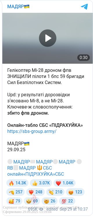«Гелікоптер Мі-28 дроном FPV знищили пілоти 59 бригади Сил безпілотних бистем», — написав військовий.