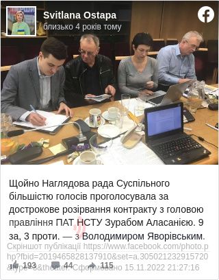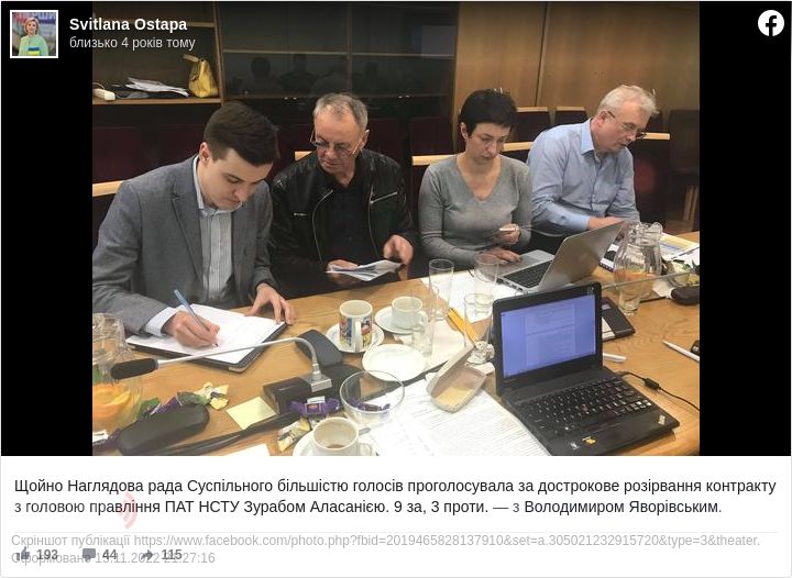 «Тільки що Наглядова рада Суспільного більшістю голосів проголосувала за дострокове розірвання контракту з головою правління НСТУ Зурабом Аласанією. 9 за, 3 проти», – написала вона.