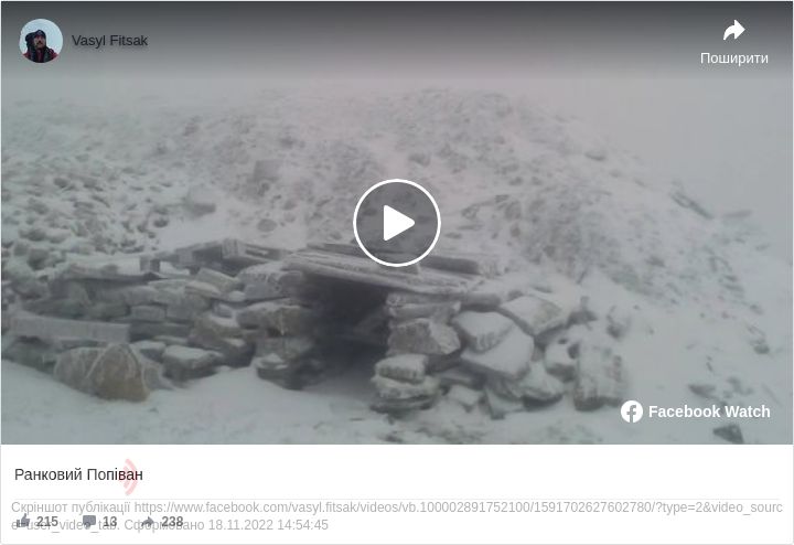 У мережі з'явились також світлини з гірської вершини, на яких видно, що її добряче засипало снігом.Рятувальник Василь Фіцак оприлюднив відео із вершини гори та зазначив, що товщина снігового покрову сягає більше 5 сантиметрів.