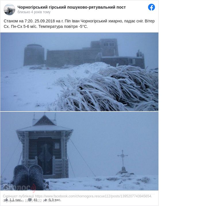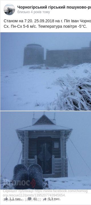 «Станом на 7:20 ранку на горі Піп Іван Чорногірський хмарно, падає сніг. Вітер східний, північно-східний 5–6 метрів за секунду. Температура повітря становить -5 градусів», – йдеться у повідомленні Чорногірського гірського пошуково-рятувального посту.